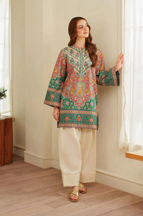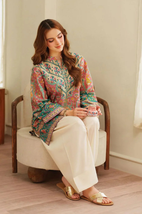 The straight-cut digital shirt with wide sleeves & detailed borders makes this outfit perfect for everyday chic styling as well as festive gatherings.